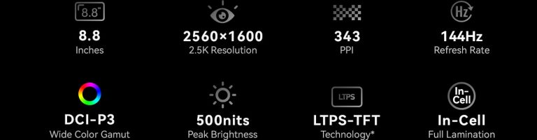 8.8-inch 144Hz Display: A smooth and vibrant viewing experience, with 2.5K resolution and up to 500 nits brightness for indoor and outdoor use.