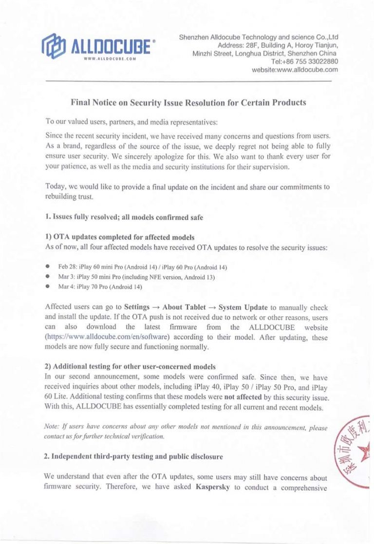 We understand that even after the OTA updates, some users may still have concerns about firmware security. Therefore, we have asked Kaspersky to perform a comprehensive independent security audit of the updated firmware. The results will be published publicly through official channels as soon as they are available, under public and media supervision.