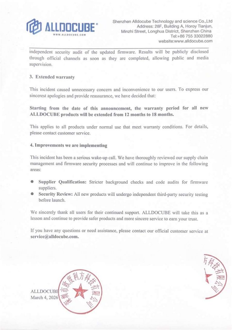 We sincerely thank all users for their continued support. ALLDOCUBE will take this as a lesson and continue to provide safer products and more sincere service to earn your trust.
