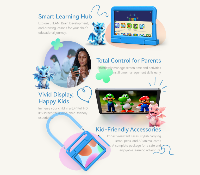 Immerse your child in an 8.4″ Full HD IPS screen for a vivid, child-friendly experience. The vibrant display, with 16 million colors, 270 PPI, and 1200:1 contrast ratio, ensures a rich and engaging visual experience for your little one.