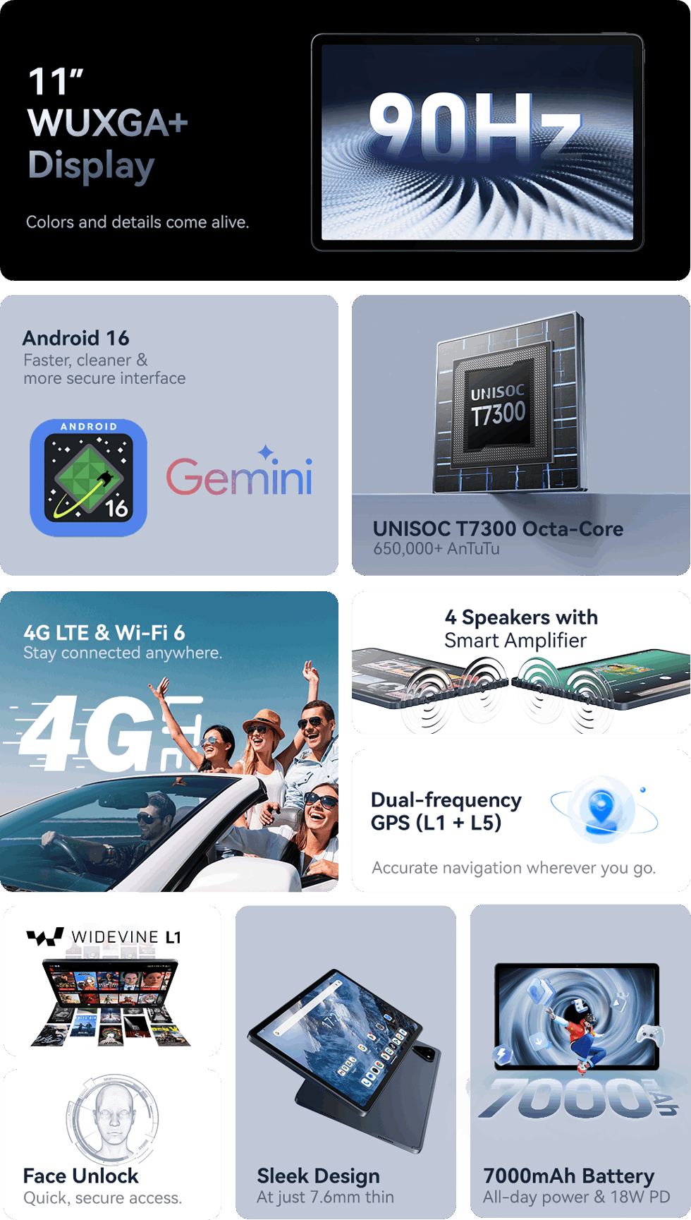 The 7000mAh battery lets you stream, browse, and create all day. When it’s time to recharge, 18W PD fast charging gets you back to full in no time—no waiting, no slowing down.
