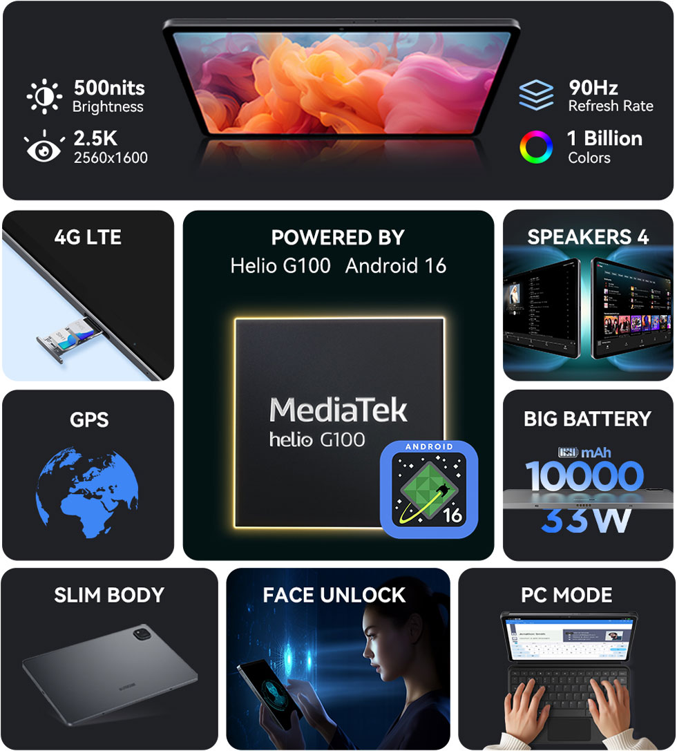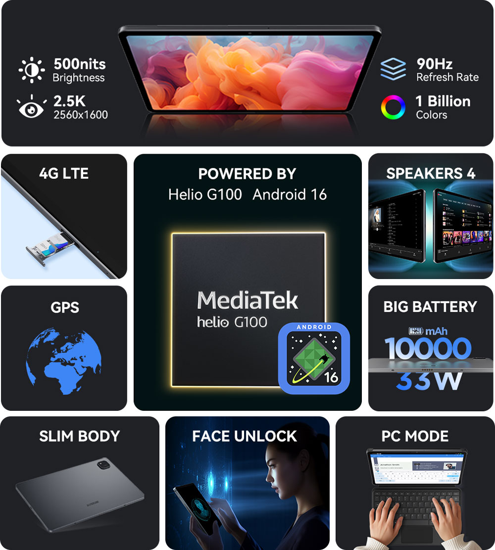 Powered by the MediaTek Helio G100, the tablet offers smooth performance for daily tasks and entertainment. With 8GB RAM (plus optional virtual expansion) and 128GB storage, multitasking stays fast and responsive. Expand up to 1TB via microSD for even more flexibility.