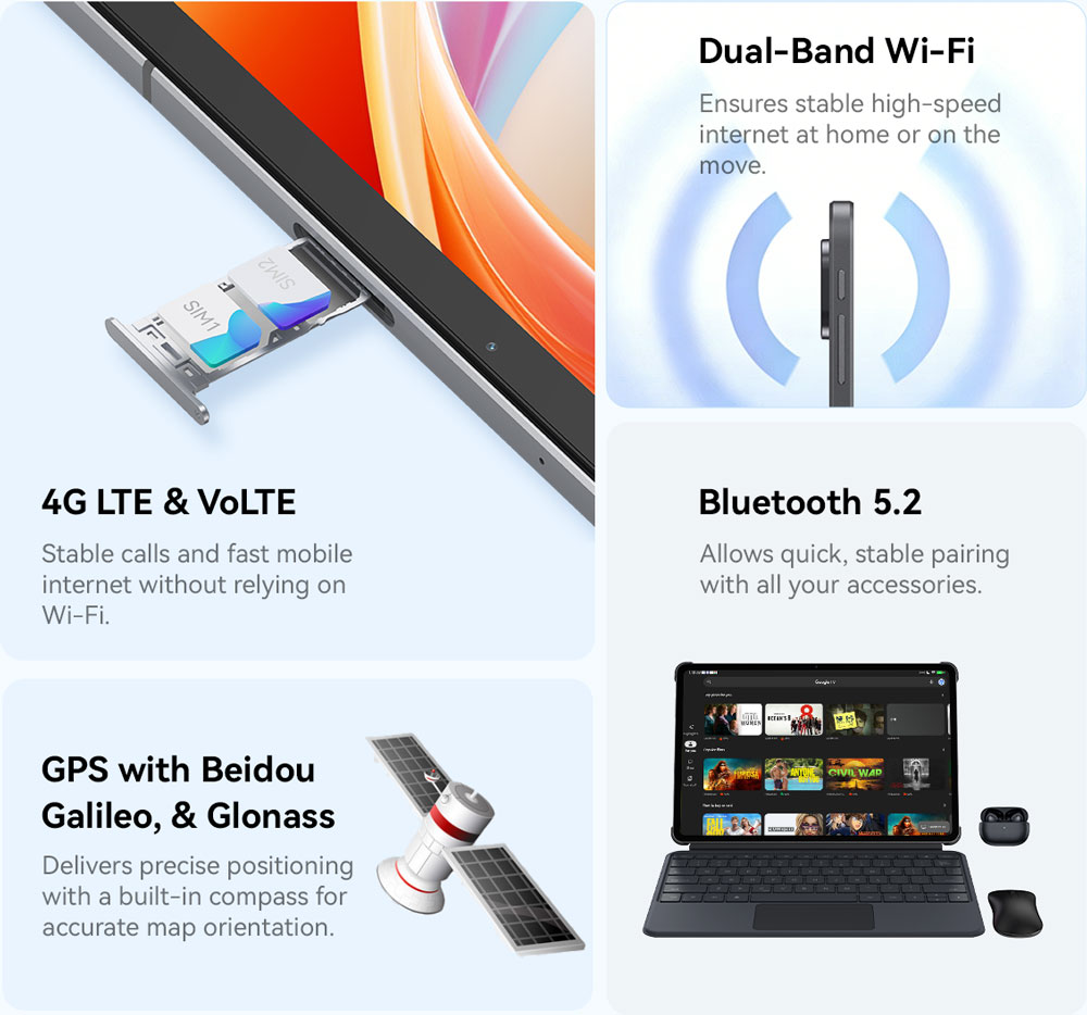 Stay connected anywhere, whether at home, on the road, or traveling abroad. The iPlay 70 Pad Pro offers complete wireless coverage: