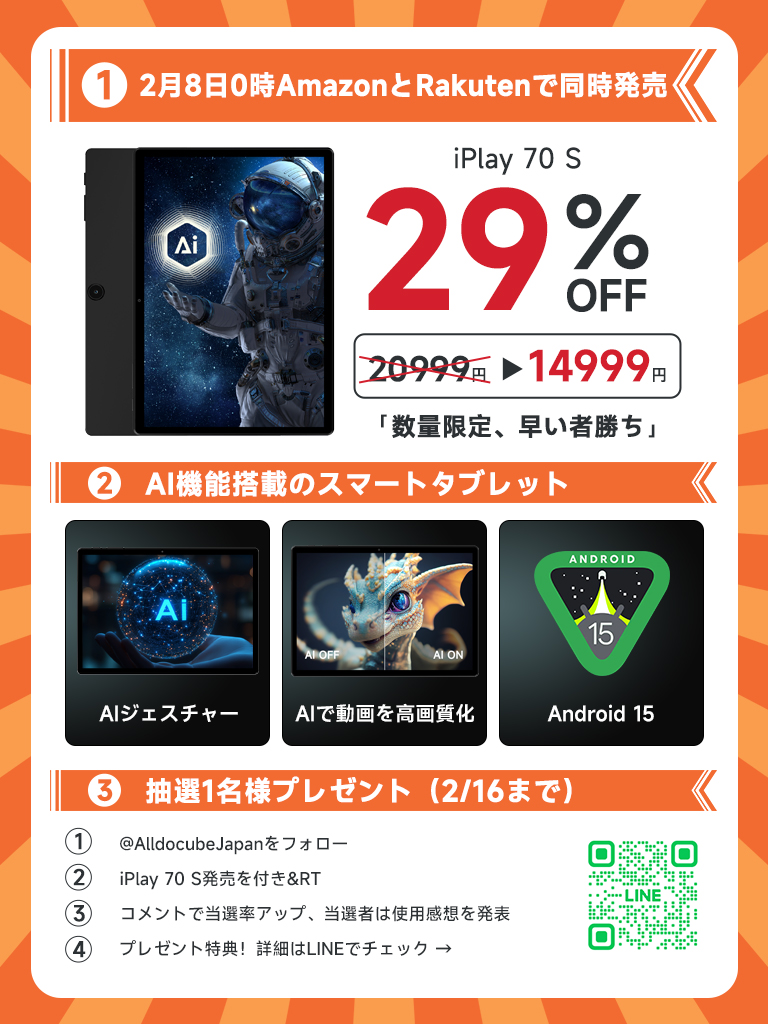 2025年2月8日、日本のAmazonと楽天にて、待望のタブレット ALLDOCUBE iPlay 70S が発売されます!価格はお手頃な14,999円。このエントリーモデルは、AI機能と最新のAndroid 15 OSを搭載し、日常使いに最適なパフォーマンスを提供します。