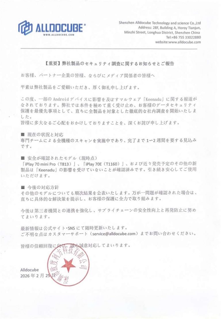 このたびは、一部Androidデバイスに関する潜在的なセキュリティ問題の報告により、皆様にご心配とご迷惑をおかけしておりますことを、深くお詫び申し上げます。