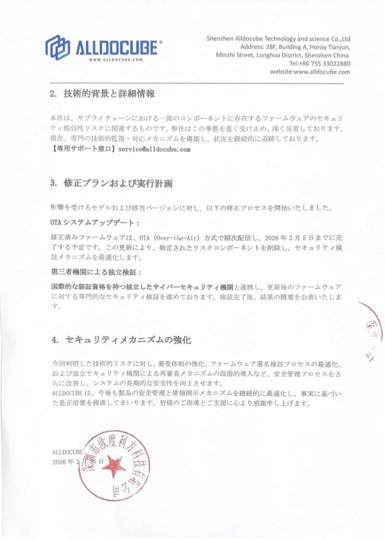 【重要なお知らせ】 深夜に大変恐れ入りますが、ALLDOCUBEタブレットのシステムセキュリティ調査に関する最新の進捗をご報告いたします。 このたびの徹底的な調査の結果、対象製品の大部分において安全性が確認されました。しかしながら、一部のモデルにおきまして、システム上の脆弱性が判明いたしました。お客様には多大なるご心配とご迷惑をおかけしておりますことを、心より深くお詫び申し上げます。 対象となるモデルには、2026年3月5日までにOTAアップデートによる修正を配信いたします。引き続き、お客様に安心して製品をご利用いただけるよう、セキュリティ体制の強化に全社を挙げて取り組んでまいります。 対象機種の詳細につきましては、添付の画像にてご確認くださいますようお願いいたします。
