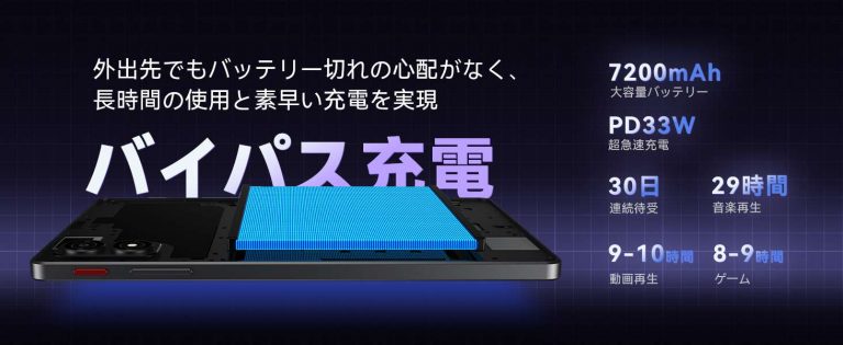 また、7200mAhの大容量バッテリーを搭載している点も見逃せません。動画視聴やゲームなどでも長時間の使用が可能で、外出先でも安心して使えます。さらに、バイパス充電に対応しているため、充電しながらのゲームプレイでもバッテリーへの負担を抑えられるのは実用面で大きなメリットです。