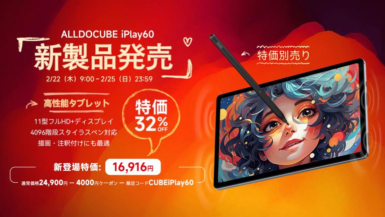 こんにちは、ALLDOCUBEのファンの皆様!待望の新製品、ALLDOCUBE iPlay 60が2月22日(木)に発売予定です❗️ 特別な発売特典でお得に! 今回の発売に際して、通常価格24,900円のところ、なんと特別クーポンが4,000...