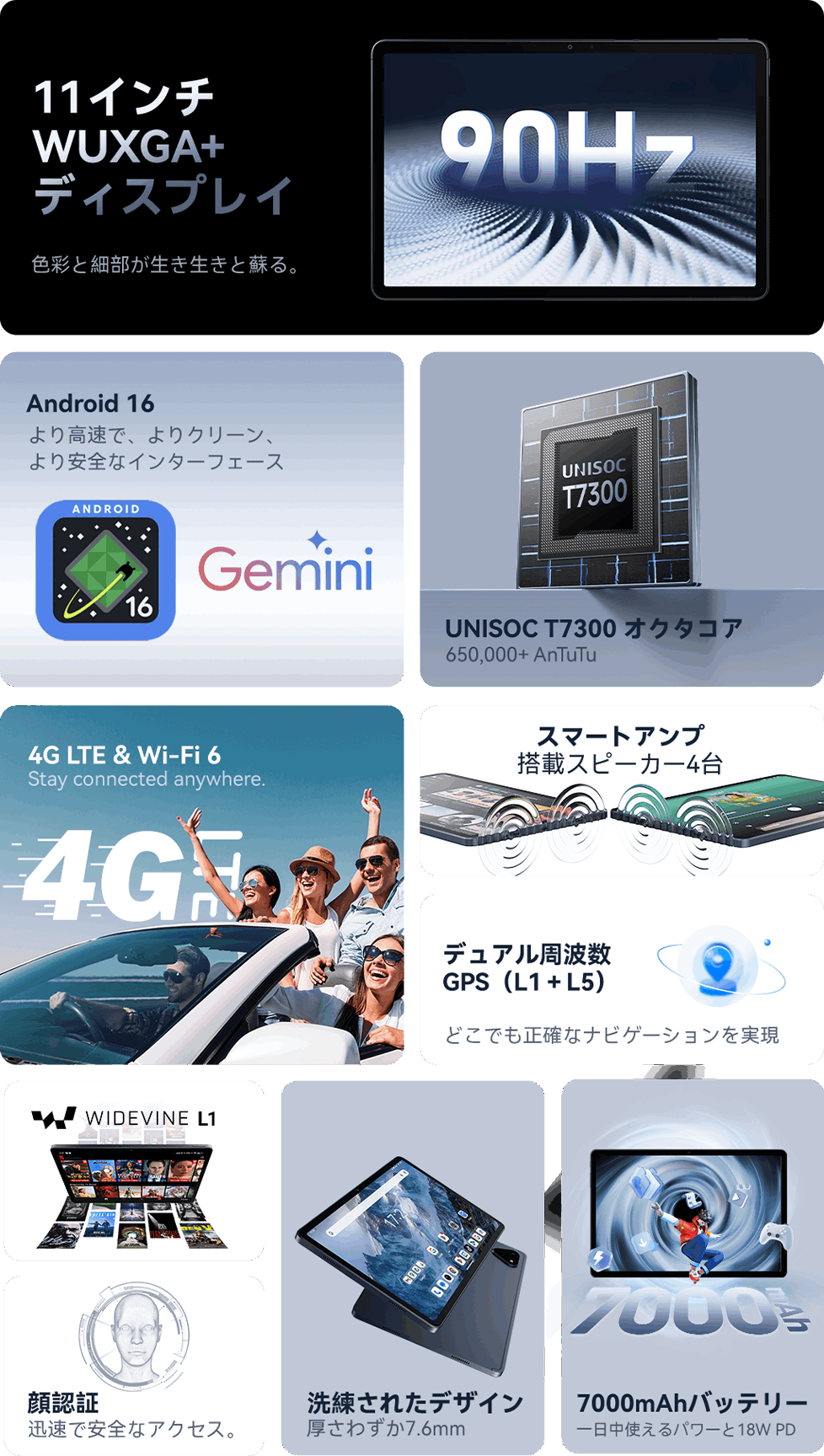 7000mAhの大容量バッテリーを搭載し、動画視聴やブラウジング、クリエイティブな作業も一日中快適に楽しめます。バッテリーが切れても、18W PD急速充電により短時間でフル充電が可能。待ち時間を最小限に抑え、スムーズな作業復帰をサポートします。